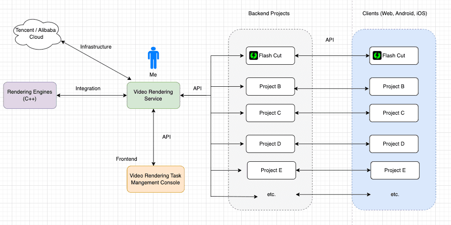 It integrated 2 video rendering engines to implement many kinds video generation, providing REST API to interact with other backend projects. The architecture is as follows.